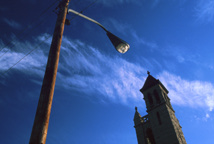 Church tower and street lamp, Fort Smith, Arkansas.